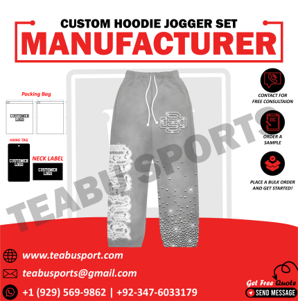 Custom Grey Hoodie Jogger Set – Screen Print, Distressed Logo, Rhinestones & Acid Wash Streetwear Manufacturer