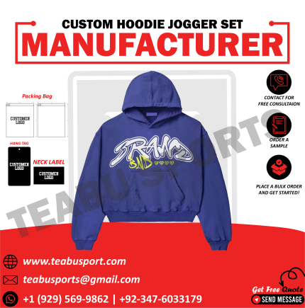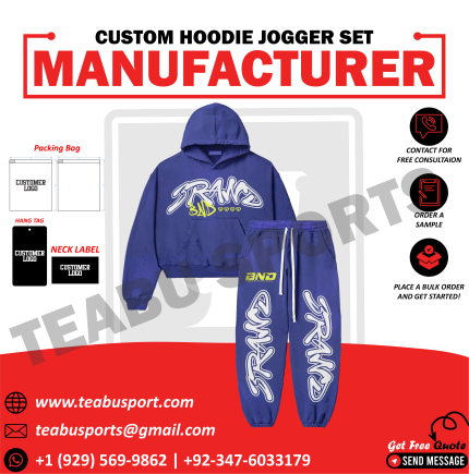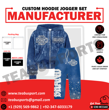 Custom Navy Hoodie Jogger Set – Screen Print, Distressed Logo, Rhinestones & Acid Wash Streetwear Manufacturer
