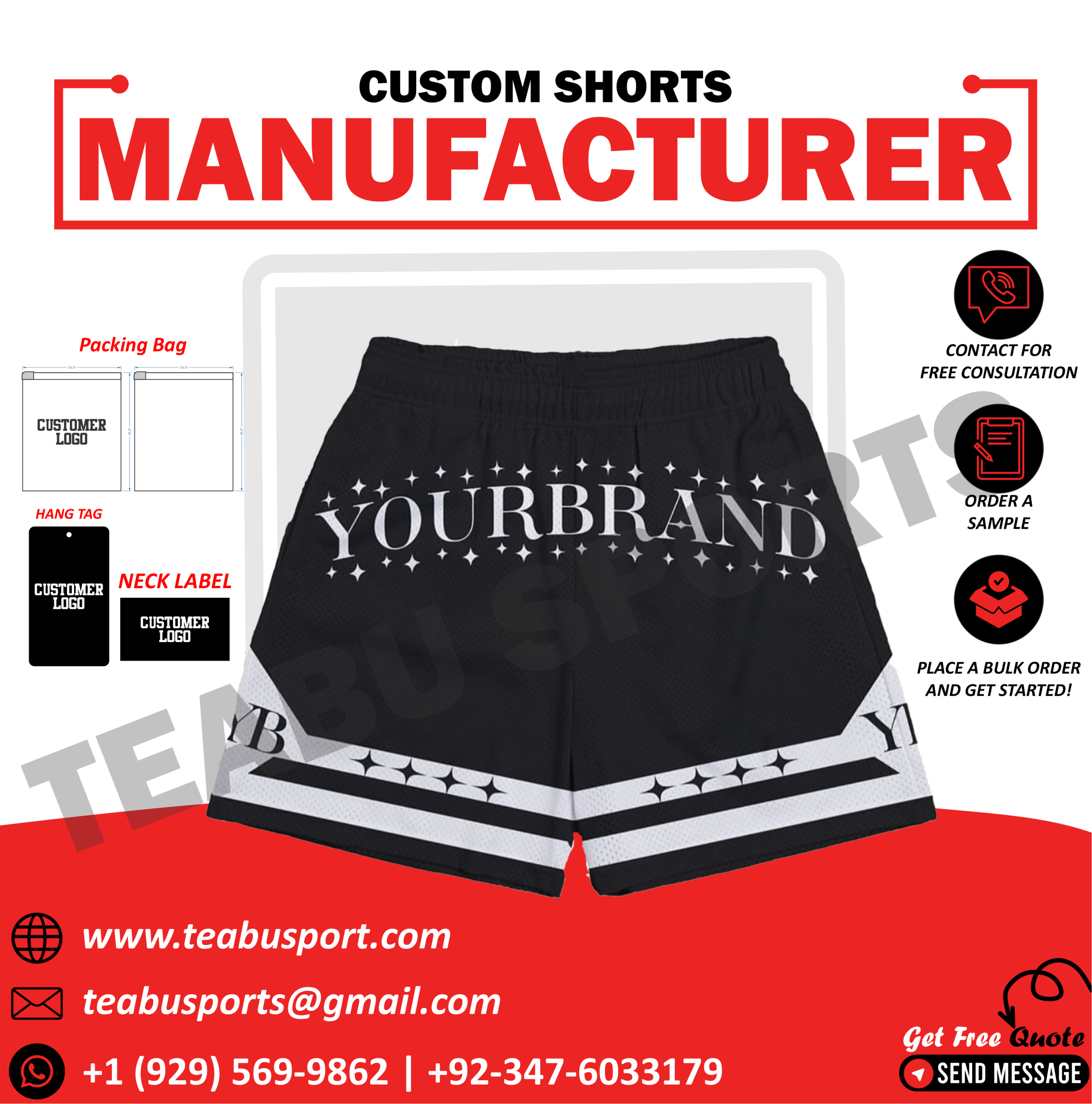 Crafted in breathable black mesh, the design is elevated by clean white “YOURBRAND” text surrounded by a line of stars across the front. The YB monogram accent and dual white star-stripe panels on the leg hems add contrast and attitude.