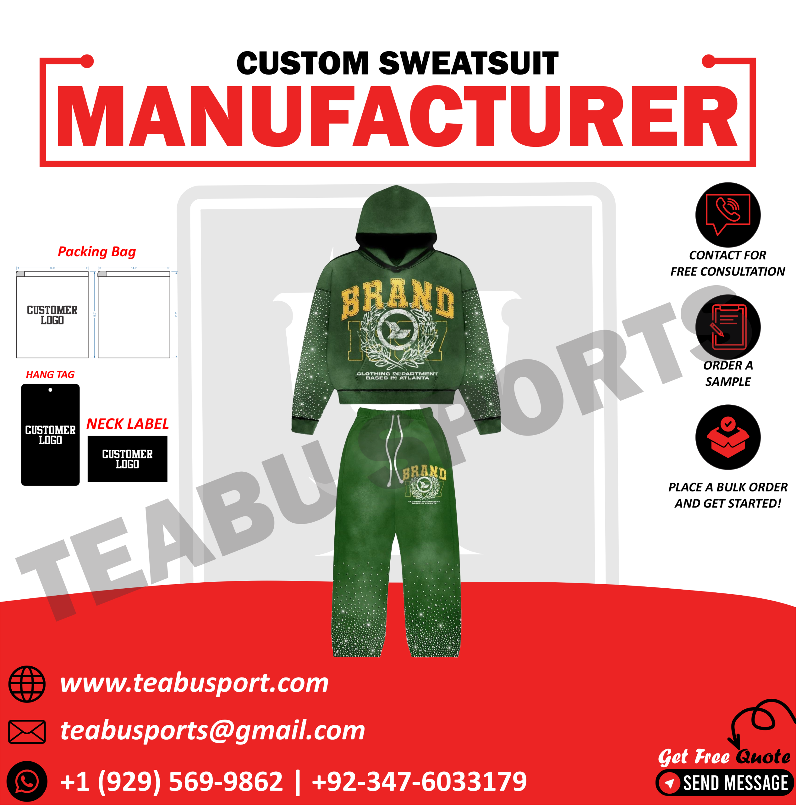 Make your next drop unforgettable with this custom green acid wash sweatsuit, featuring detailed screen print logos and rhinestone embellishments for an eye-catching, high-end streetwear look. The acid wash adds vintage flair, while rhinestones bring shine and edge—perfect for trendsetting fashion brands.