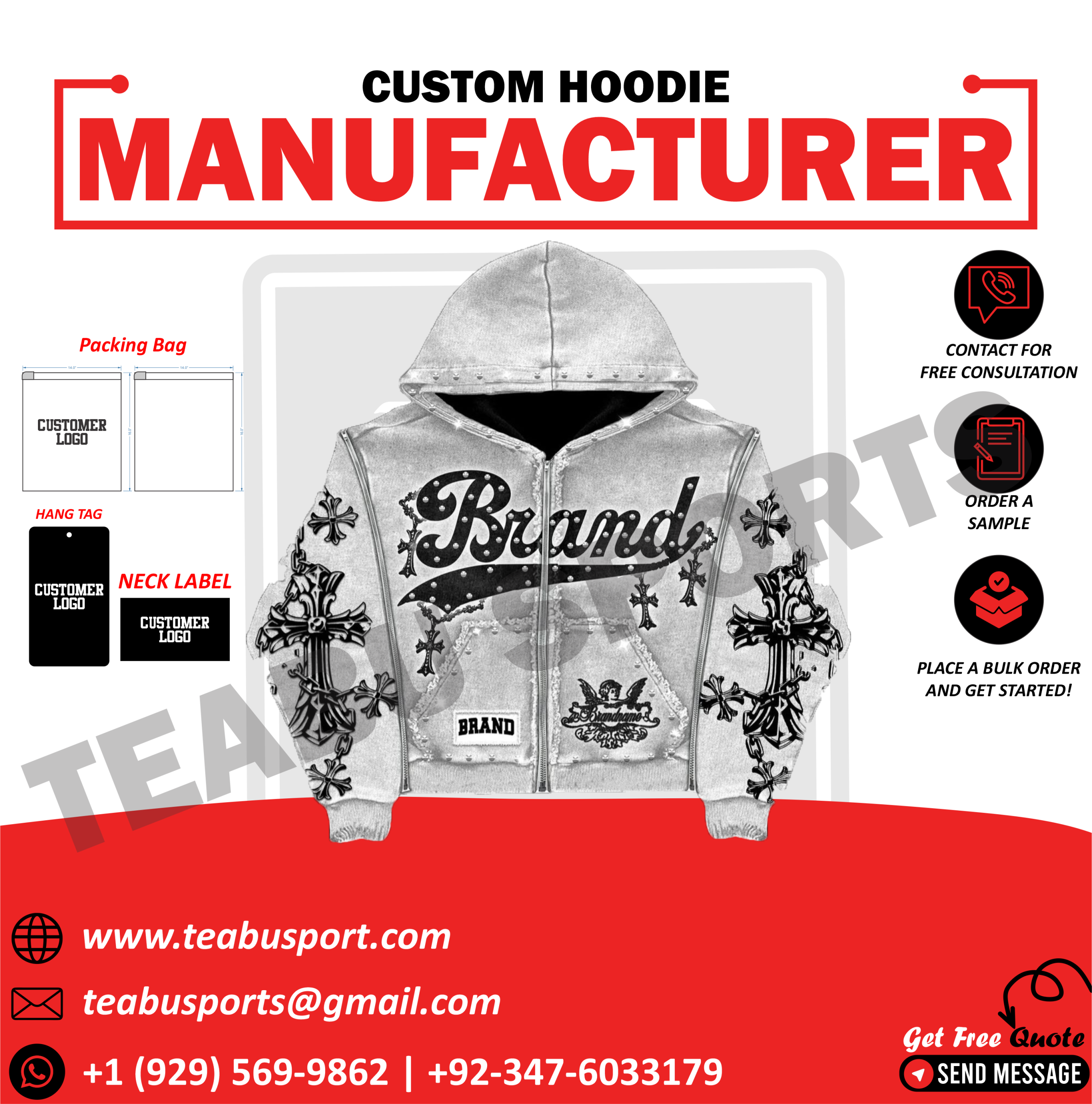 Elevate your streetwear line with this custom grey hoodie, detailed with layered screen prints, shimmering rhinestones, and premium embroidery. Fully customizable for brands, artists, and influencers.