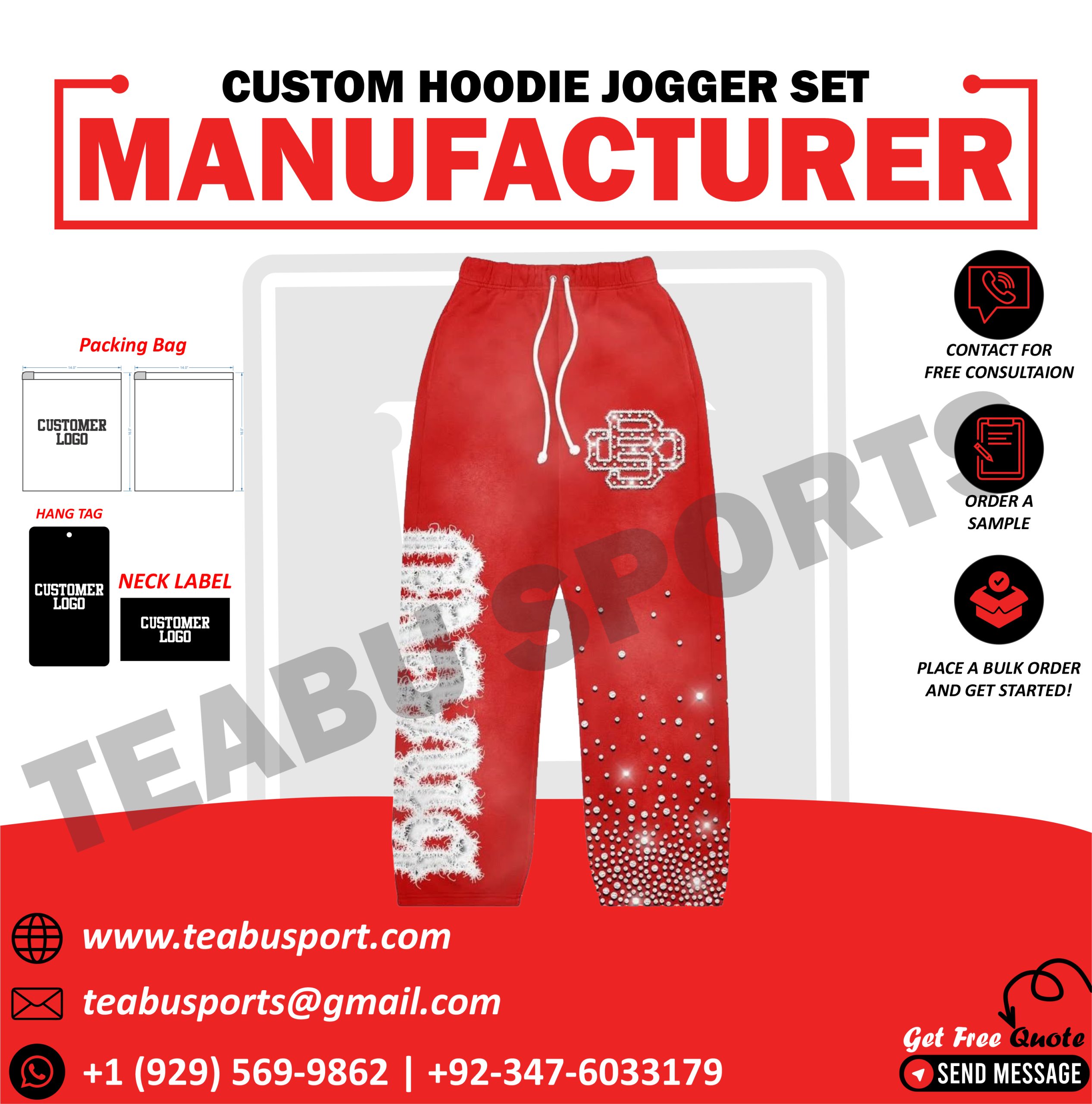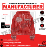 Make a bold statement with our custom Red hoodie and jogger set, designed with eye-catching screen print graphics, distressed logo styling, rhinestone embellishments, and a unique acid wash finish. This set is perfect for streetwear brands looking to create trend-setting, premium looks that turn heads.